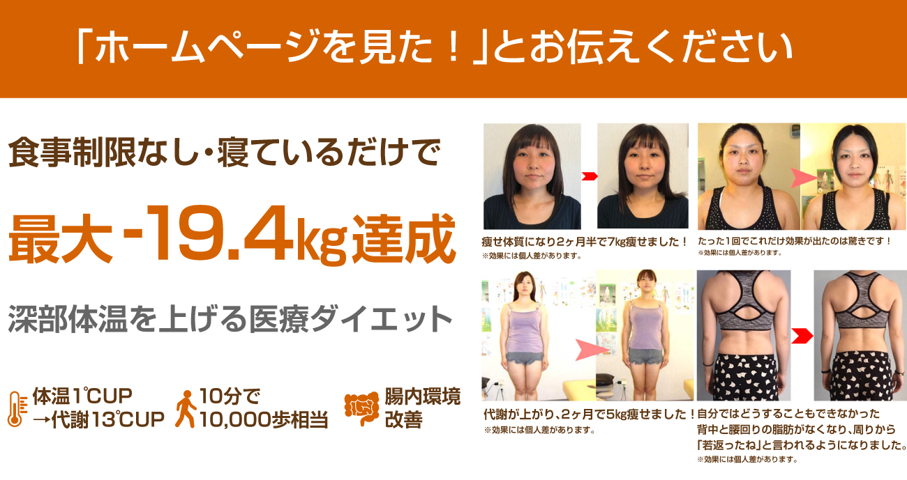 今まで色々なダイエットにチャレンジしてきましたが、ことごとく失敗してきました。こちらで、最新医療ダイエットの深温ダイエットが受けられるということで、チャレンジしてみようと思って来ました。